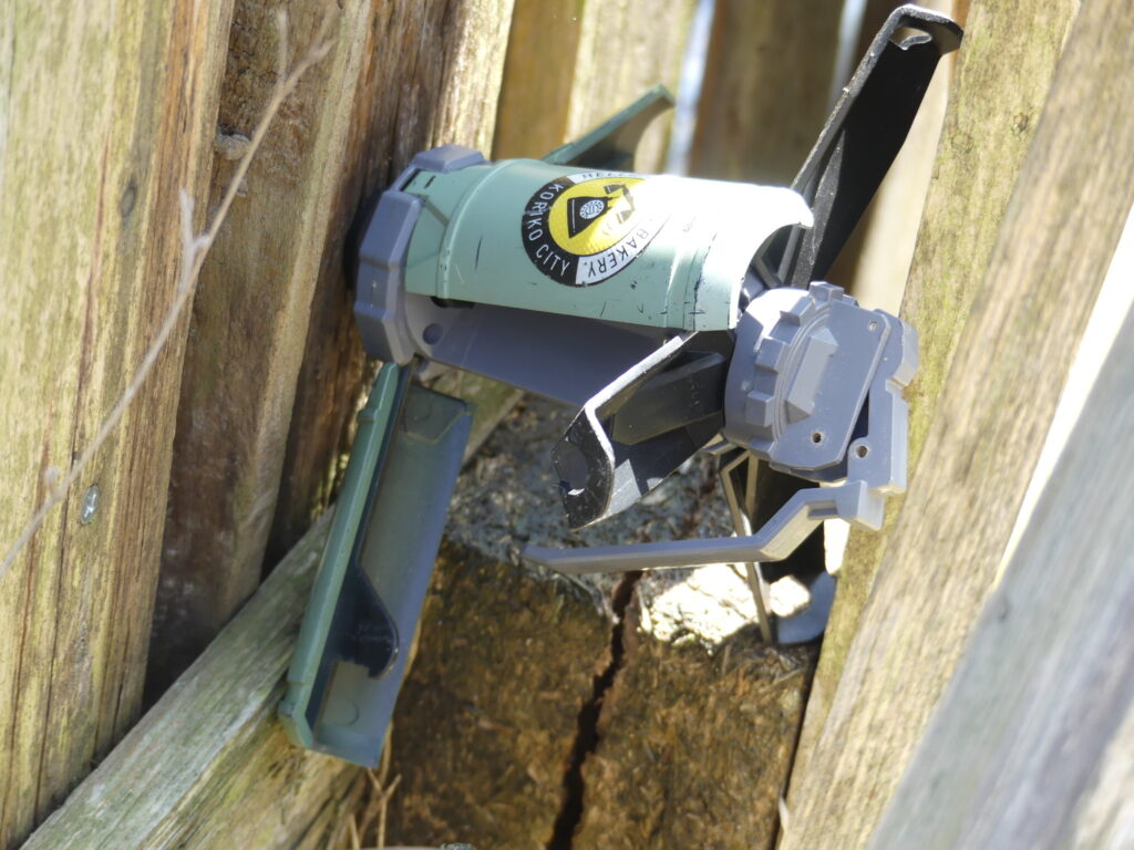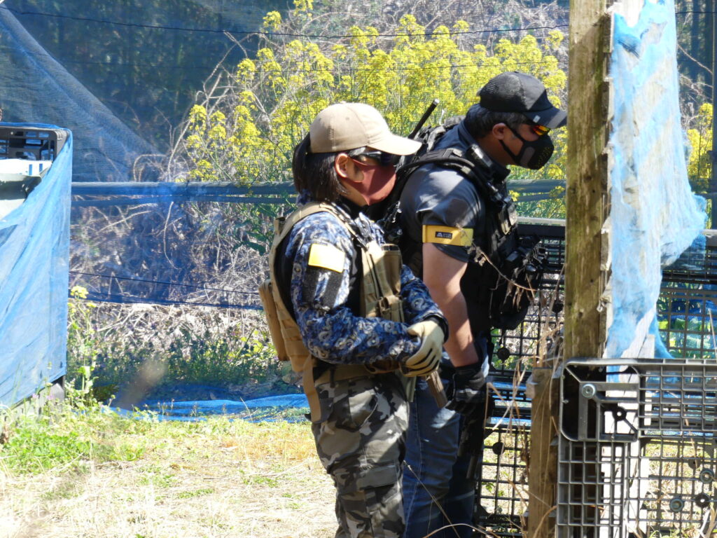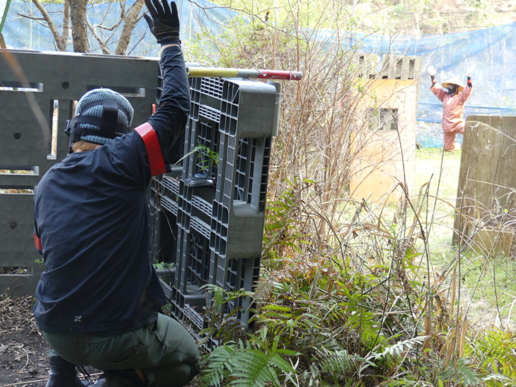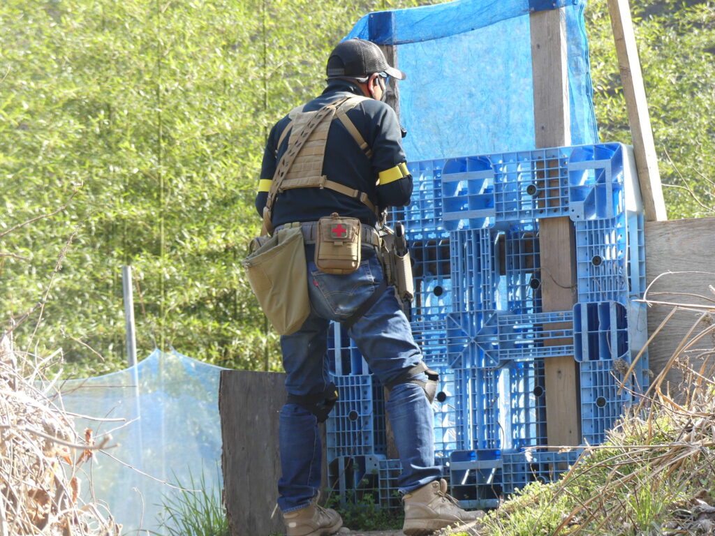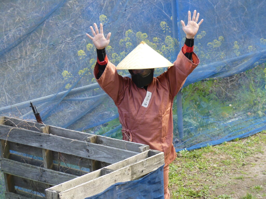服の色はもっと暗い色を探していたらしいのですが、「まぁこの色でもいいか」となり、頭の笠については近所のホームセンターに普通に売っていたらしいです。